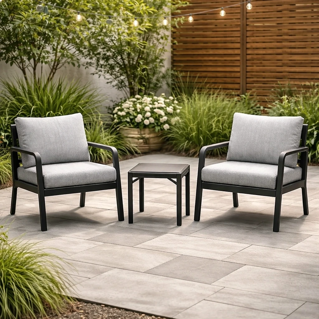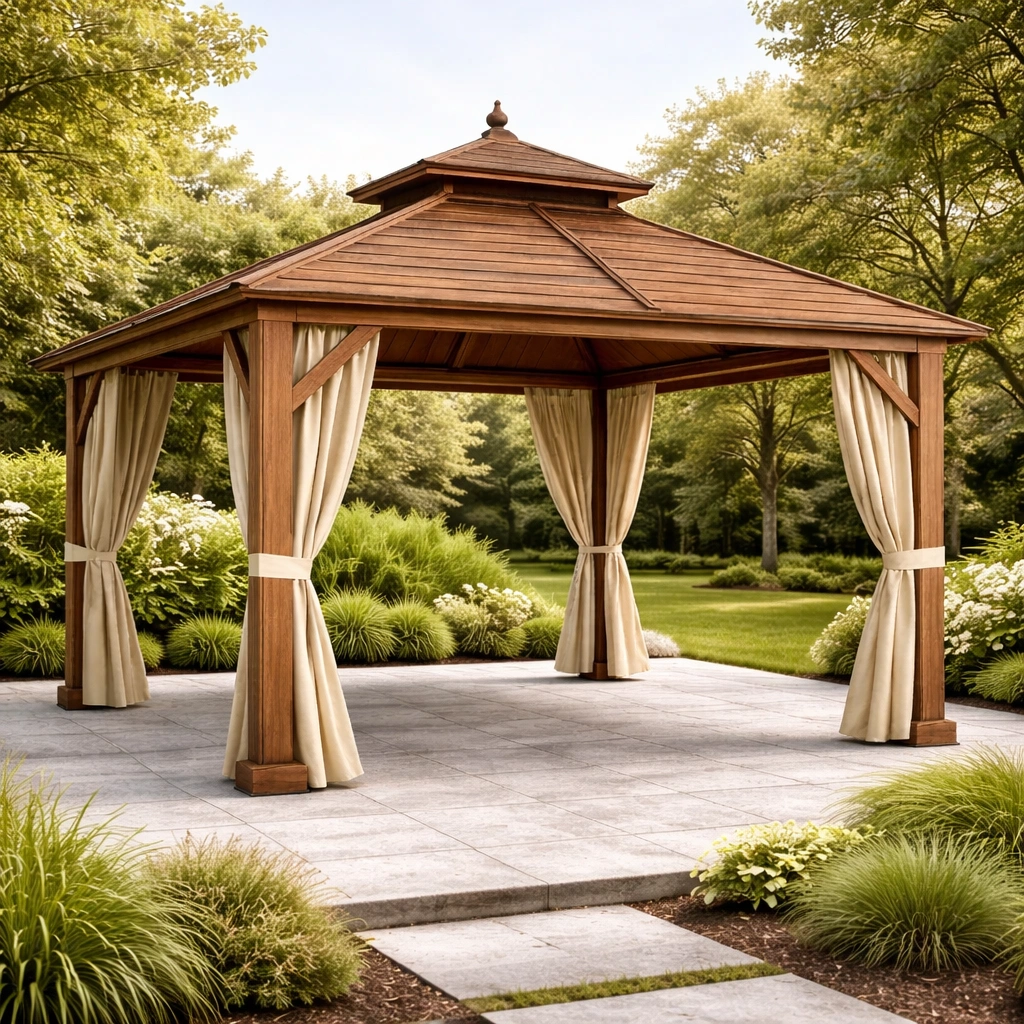 Pavillon de jardin en bois adapté aux espaces extérieurs tels que les cours et jardins, équipé d’un toit pare-soleil et de rideaux latéraux, offrant une fonction de protection de base et de délimitation de l’espace.
