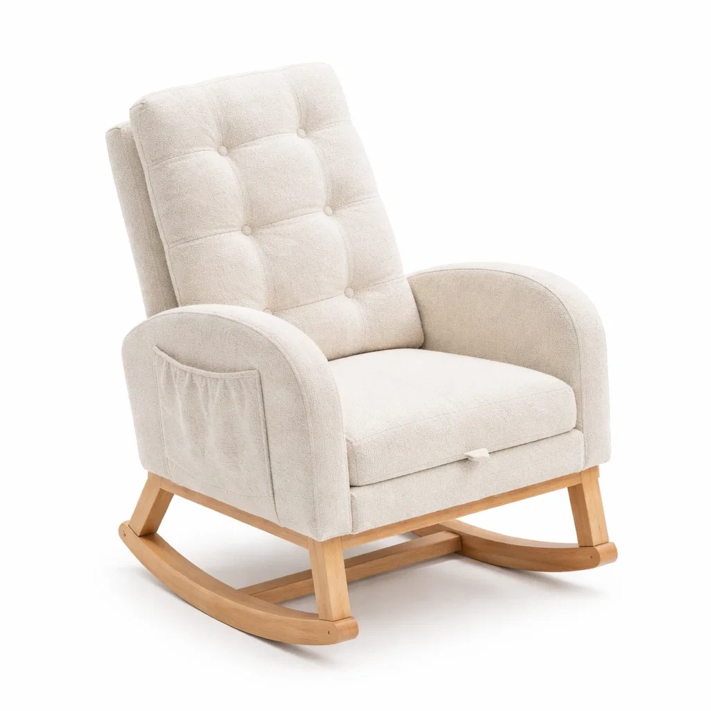 Fauteuil à bascule en tissu beige avec structure en bois